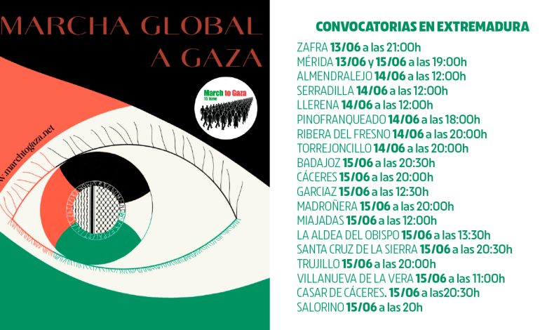 Durante el fin de semana, se celebrarán en Extremadura concentraciones en varias localidades de la región en apoyo a la Marcha Global a Gaza. El sábado 14 de junio, a mediodía, se celebrarán concentraciones en Villanueva de la Serena, Llerena y Navalmoral de la Mata, como parte de la protesta estatal convocada por decenas de organizaciones bajo el lema “Parar la guerra es cosa de todos”. Estas acciones tienen un carácter unitario y apartidista, y buscan visibilizar el rechazo popular a la ocupación y a los crímenes cometidos por Israel con total impunidad.